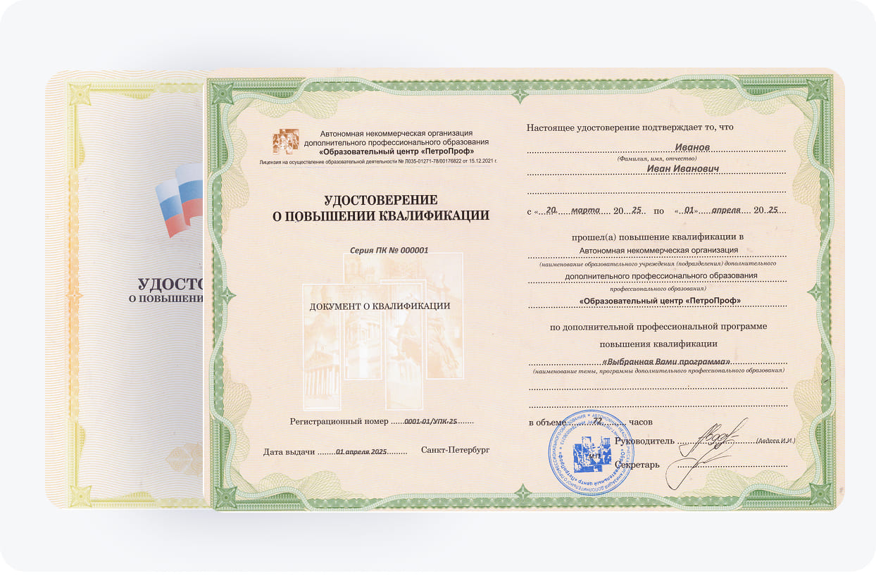 Весь процесс повышения квалификации проходит в дистанционном обучении, позволяя удобно планировать своё время и получать качественные знания независимо от места проживания и рабочей нагрузки.